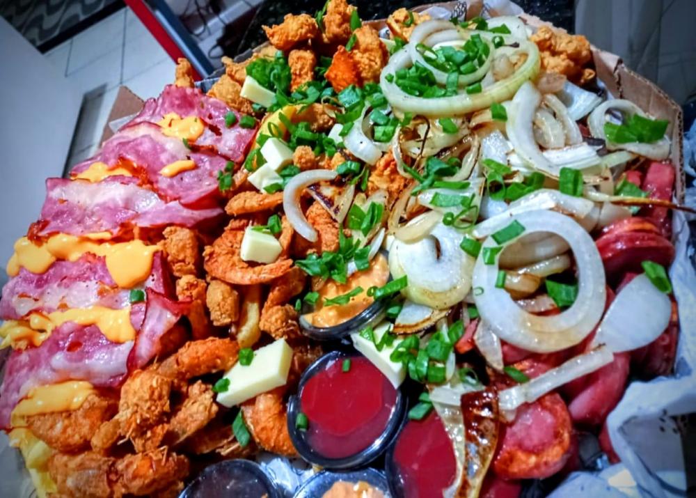 Camarão empanado filé de tilápia calabresa acebolada frango empanado fritas com cheddar e bacon tamanho familía
