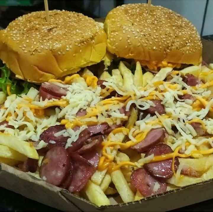 Lanche na caixa com 2 x tudo artesanal+ batata frita+ calabresa+bacon+cheddar