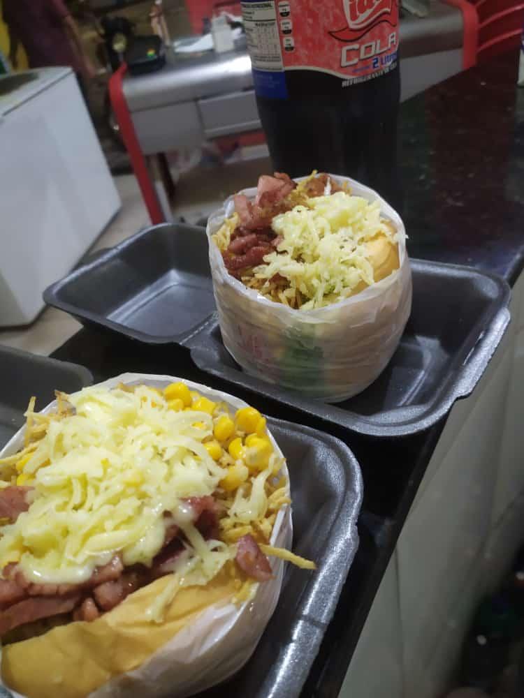 Pão bife de hamburguer queijo alface tomate milho e batata . Acompanha maionese da casa e catchup