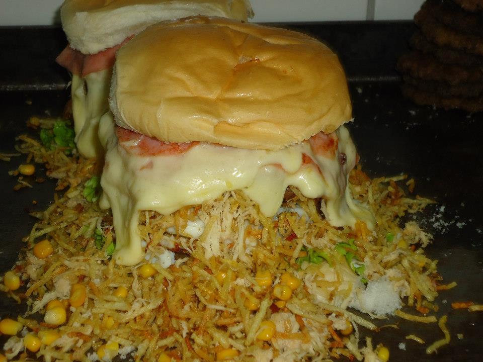 Pão bife de hamburguer queijo ovo presunto alface tomate milho e batata . Acompanha maionese da casa e catchup