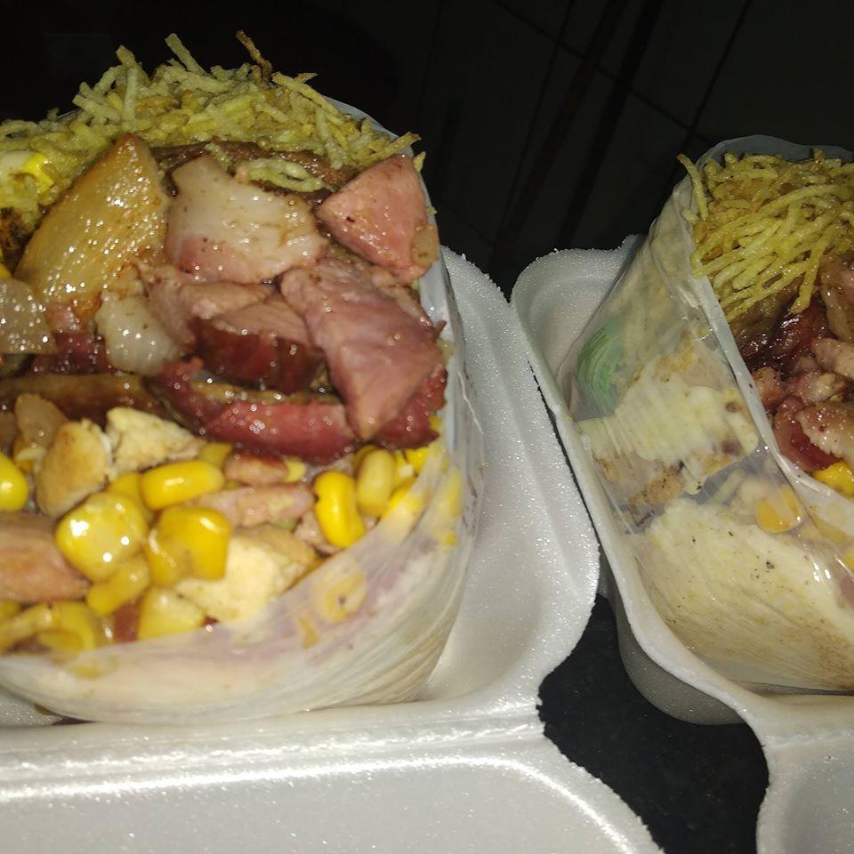 Pão bife de hamburguer queijo ovo bacon alface tomate milho e batata . Acompanha maionese da casa e catchup
