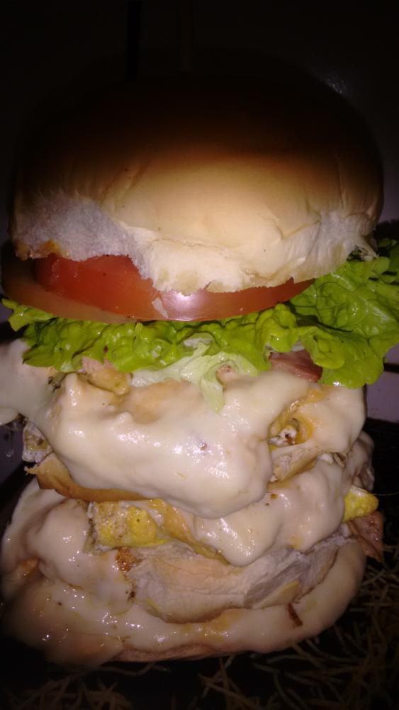 Pão 4 bife de hamburguer queijo ovo presunto alface tomate milho e batata . Acompanha maionese da casa e catchup